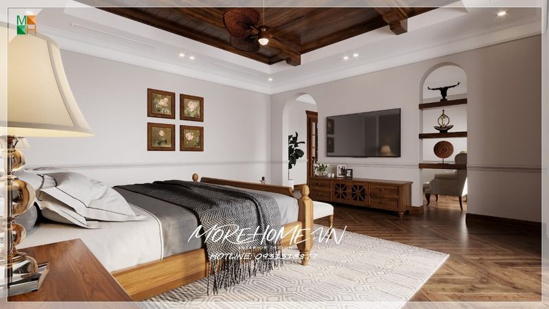 Trong không gian lãng mạn của một phòng ngủ tại Hội An, màu sắc đóng vai trò then chốt trong việc tạo nên bầu không khí ấm áp và gần gũi. Những gam màu nhẹ nhàng như hồng pastel, xanh mint hay kem sẽ mang lại cảm giác dễ chịu và dịu dàng, lý tưởng cho những khoảnh khắc bên người thương. Bên cạnh đó, màu vàng nhạt từ ánh sáng sẽ giúp làm nổi bật từng đường nét thiết kế, tạo nên sự phân chia nhẹ nhàng giữa các khu vực mà vẫn giữ được tính liên kết cho toàn bộ không gian.