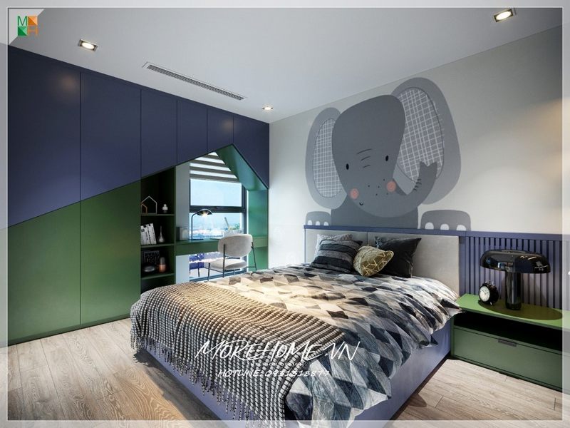 Phòng ngủ con được thiết kế theo hình dáng ngôi nhà độc đáo với bàn học kết hợp tủ quần áo và kệ sách.