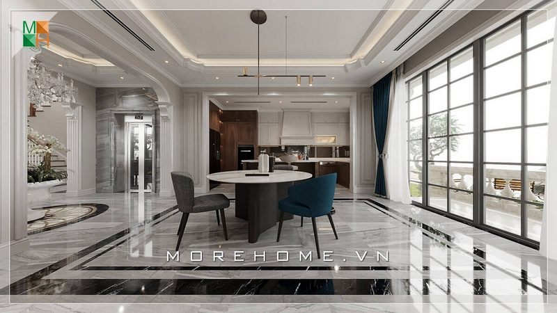 Trang trí nội thất phòng ăn của biệt thự Vinhomes The Harmony theo phong cách cao cấp với một bàn ăn đẹp tổng hợp cổ điển và hiện đại.