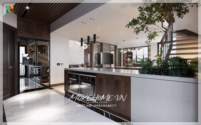 Bàn đảo bếp được thiết kế bằng mặt đá nhân tạo kết hợp với tủ gỗ tự nhiên giúp phân chia rõ ràng và tự nhiên giữa khu vực bếp và phòng khách.
