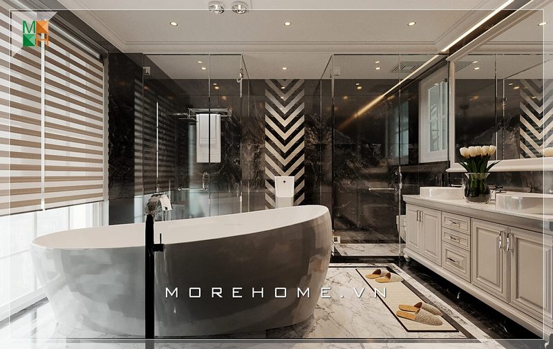 Nội thất phòng tắm được bố trí hợp lí, khoa học, mặt tủ lavabo ốp đá nhân tạo cao cấp mang đến sự sang trọng và luôn sạch sẽ