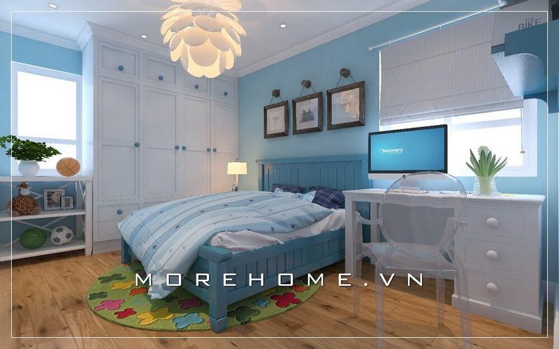 Giường ngủ bằng gỗ công nghiệp cao cấp phun sơn màu xanh dương sẽ góp phần tạo nên cảm giác thư giãn và làm điểm nhấn nổi bật cho không gian phòng ngủ bé.