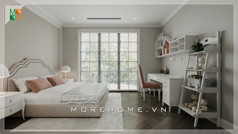 Tủ quần áo cánh kính và bàn học bằng gỗ tự nhiên sơn trắng mang đến phong cách đương đại đơn giản nhưng sang trọng cho phòng ngủ con.