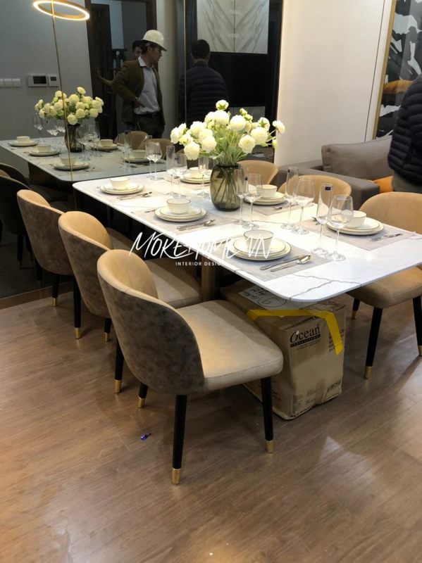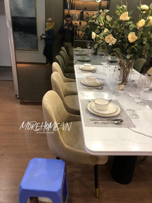 Sản phẩm bàn ăn mặt đá nhân tạo vân mây trắng cùng với 6 ghế chân sắt bọc nệm nỉ màu be, kiểu dáng nhỏ gọn hiện đại được Morehome thi công để làm bàn ăn cho phòng ăn chung cư được cận cảnh.